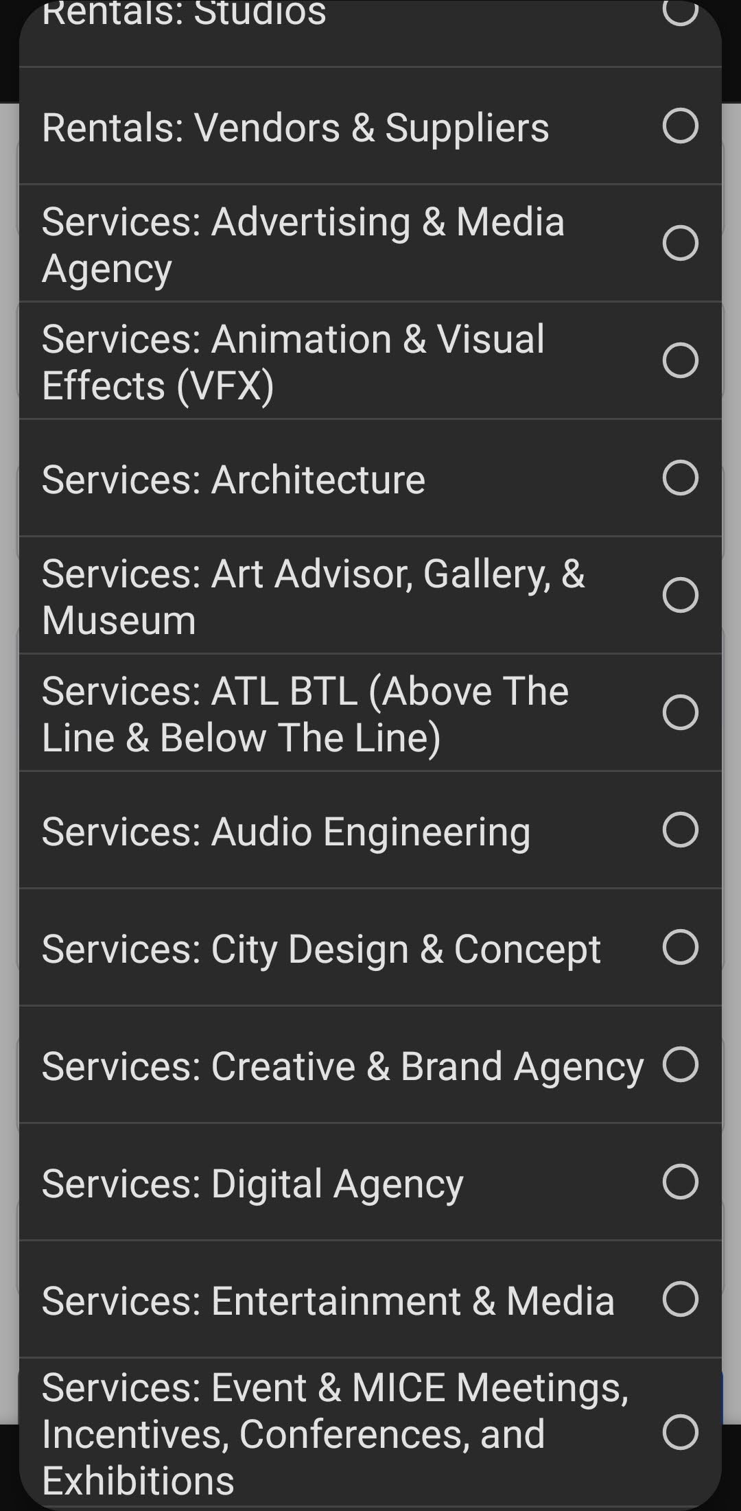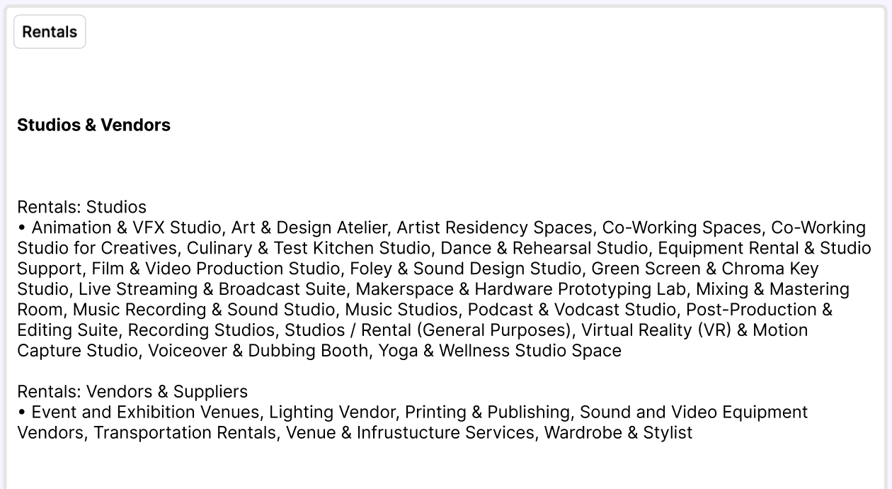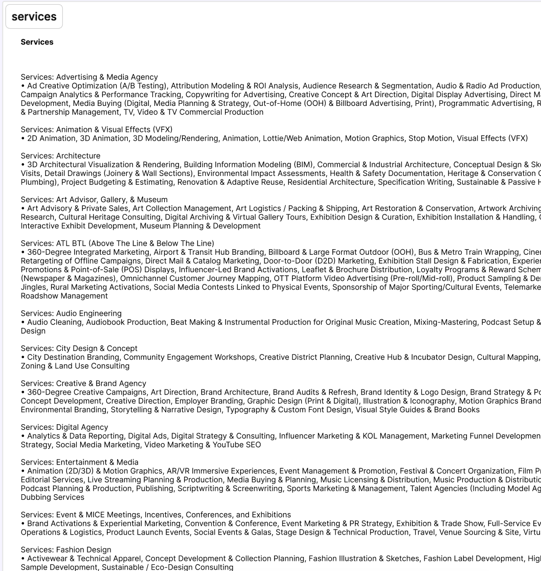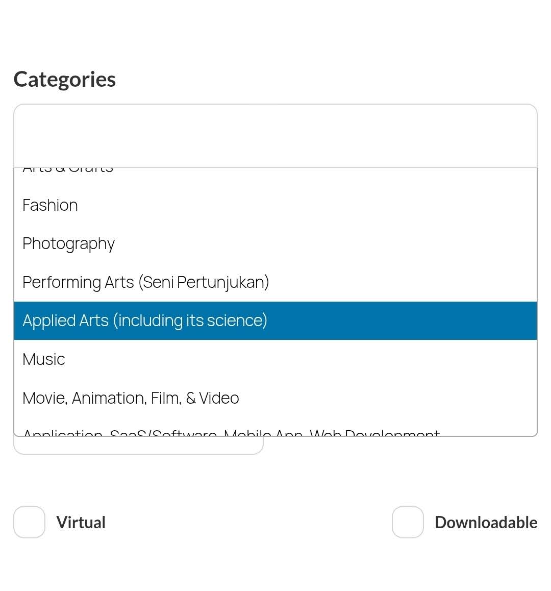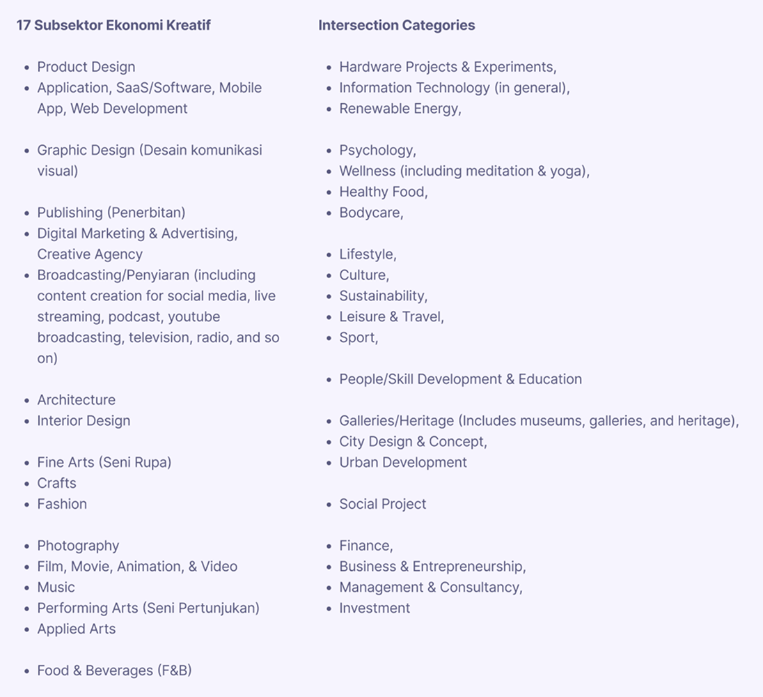 Arts & Crafts (Seni Rupa & Kriya), Fashion, Fotografi, Performing Arts (Seni Pertunjukan), Applied Arts (including its science), Music, Movie/Animation/Video, Application/SaaS/Software/Web Development, Product Design, Graphic Design, Interior Design, Architecture, Publishing (Penerbitan), Digital Marketing & Social Media Advertising (including its creative process & development), Broadcasting (live streaming/content creation on social media/podcast/youtube broadcasting/Television/Radio), Kuliner (any F&B businesses including coffee or tea or similar businesses)