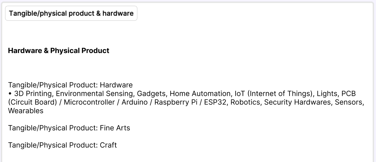 Hardware Projects & Experiments, Information Technology (in general), Culture, Lifestyle, Psychology, Wellness (including meditation & yoga), Healthy Food, Bodycare, Sustainability, Renewable Energy, Sport, Leisure & Travel, Social Project, Finance, Business & Entrepreneurship, Management & Consultancy, Investment, People/Skill Development & Education, Galleries/Heritage/Museums, City Design & Concept, Urban Development