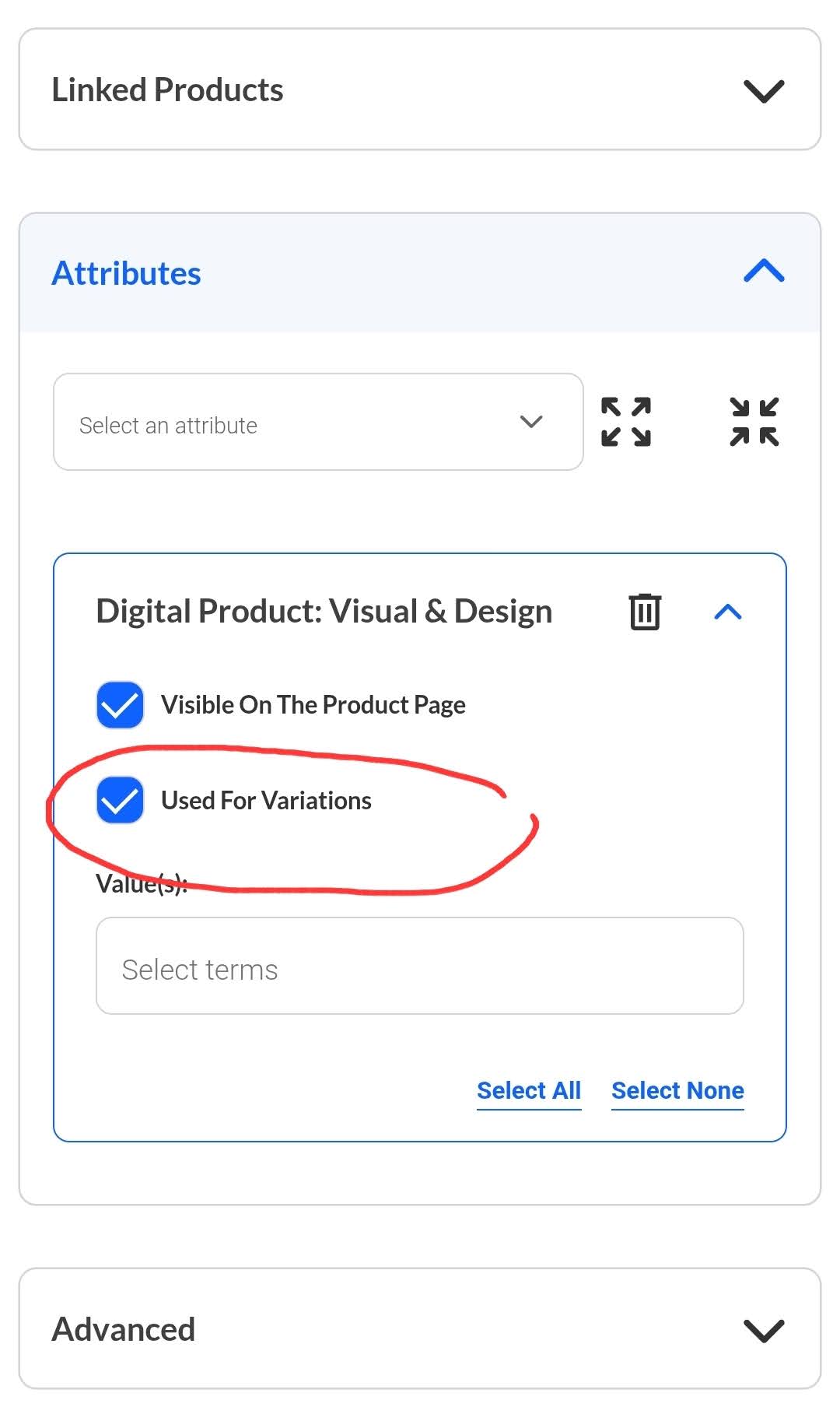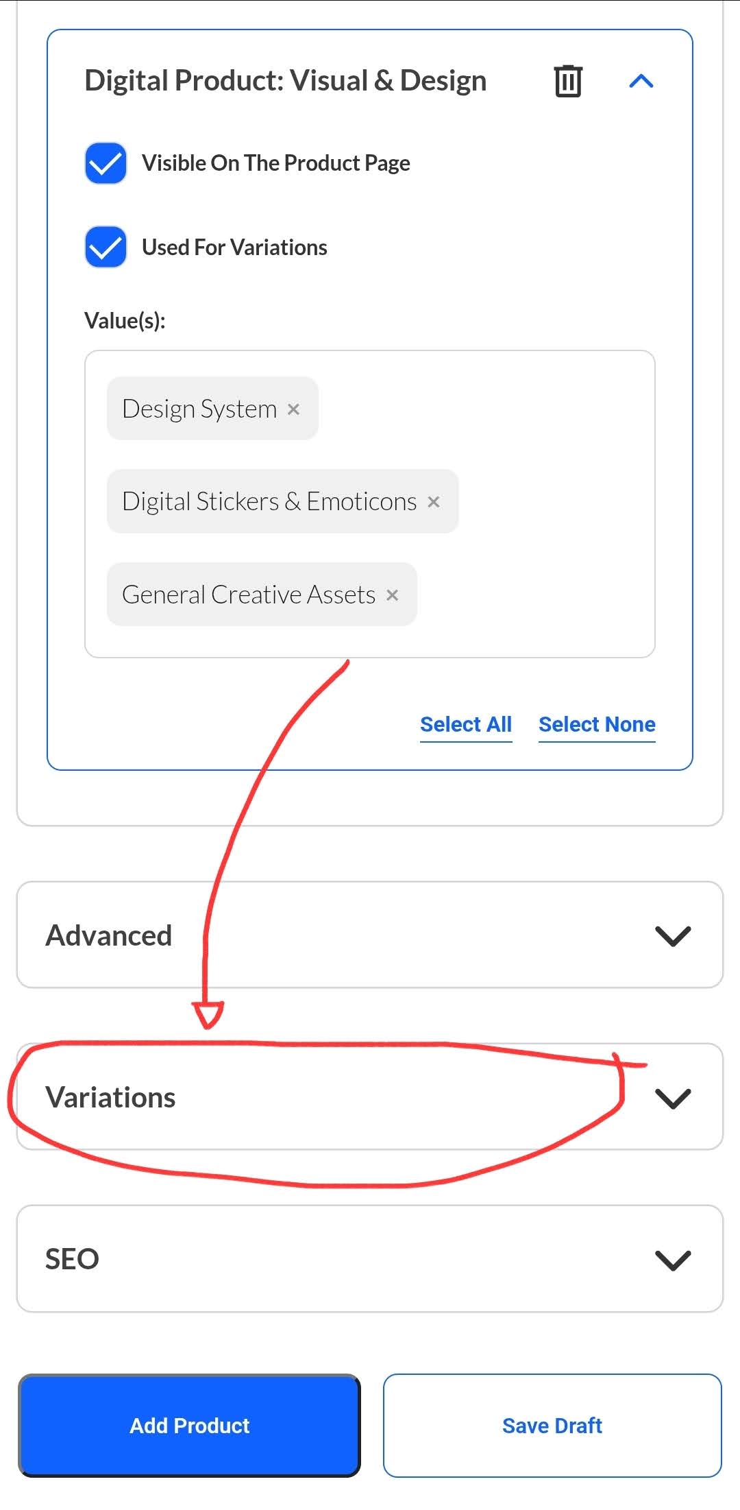 Lo harus check box “Used For Variations” seperti gambar di atas. Dan ini sangat krusial, klo lo ga centang box nya, nanti di step selanjutnya ga bakal bisa kebuka fiturnya.